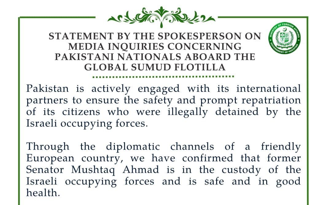 ترجمان دفتر خارجہ کے مطابق پاکستانی شہریوں کو اسرائیلی قابض افواج نے غیر قانونی طور پر حراست میں لیا، جس کی تصدیق ایک دوست یورپی ملک کے ذریعے سفارتی چینلز سے کی گئی ہے۔ ترجمان نے بتایا کہ سابق سینیٹر مشتاق احمد اس وقت اسرائیلی افواج کی تحویل میں ہیں، تاہم وہ محفوظ اور خیریت سے ہیں، اور انہیں عدالت میں پیش کیا جائے گا۔ دفتر خارجہ کا کہنا ہے کہ اس سے قبل بھی ان پاکستانیوں کی واپسی کو مربوط کیا گیا جو فلوٹیلا سے پہلے اترے تھے۔ ترجمان نے برادر ممالک کا شکریہ ادا کرتے ہوئے کہا کہ پاکستان اپنے شہریوں کے تحفظ اور بحفاظت واپسی کے لیے ہر ممکن اقدام جاری رکھے گا۔