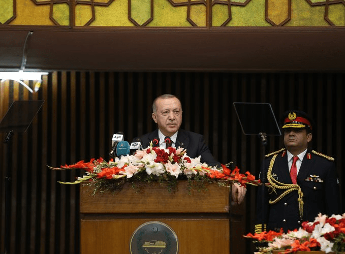 The 24-minute speech of Tayyip Erdogan, who arrived here Thursday on a two-day official visit, focused on Pakistan and Turkey’s joint road-map of development and prosperity, Turkey’s support for Kashmir cause and need for unity among Islamic countries to fight common challenges including poverty and Islamophobia.