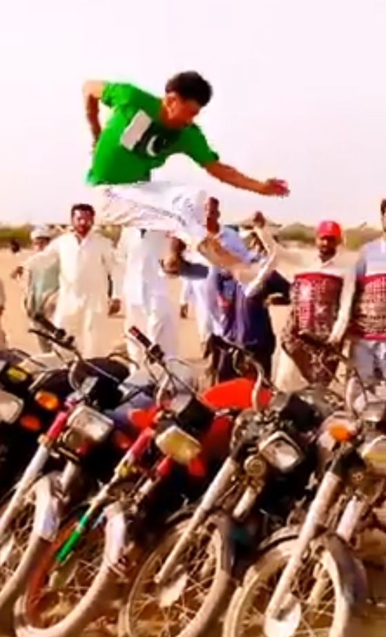 Pakistani Social media is flooded with viral video of a youngster who took a massive long jump over 11 bikes. A 22 years Asif aka Asif Machiwala long jumped over 11 motorbikes and covered a distance at least 22 feet. He is residence of Thatta district, rural area of Sindh Province Pakistan.