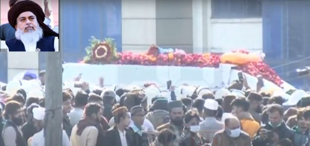 Khadim’s body is being brought to the park in an ambulance. TLP supporters have formed a human chain in front of the vehicle and are walking in front of it.