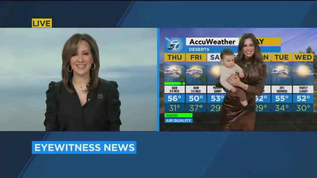 The female anchor was broadcasting weather, live when her son suddenly enters the room and starts holds mother, but instead of irritates, female anchor picked up the baby with a smile on her lips and completes full story.