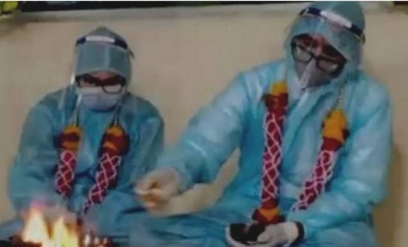 The couple was seen wearing blue protective suits as they tied the knot at a marriage hall in Ratlam. Along with the couple, the priest and few close family members too were seen with PPE suits.