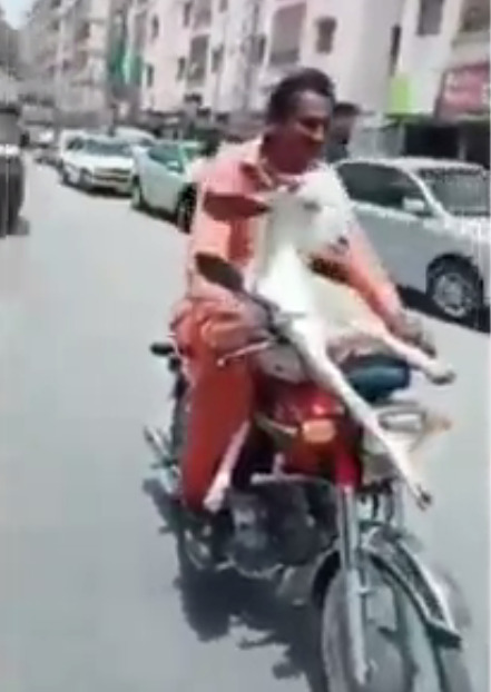 A bizarre video viral on social media in which a man could be seen riding a motorbike with a goat sitting on the vehicle’s fuel tank. It looks like the goat was purchased for Eid-ul-Adha.