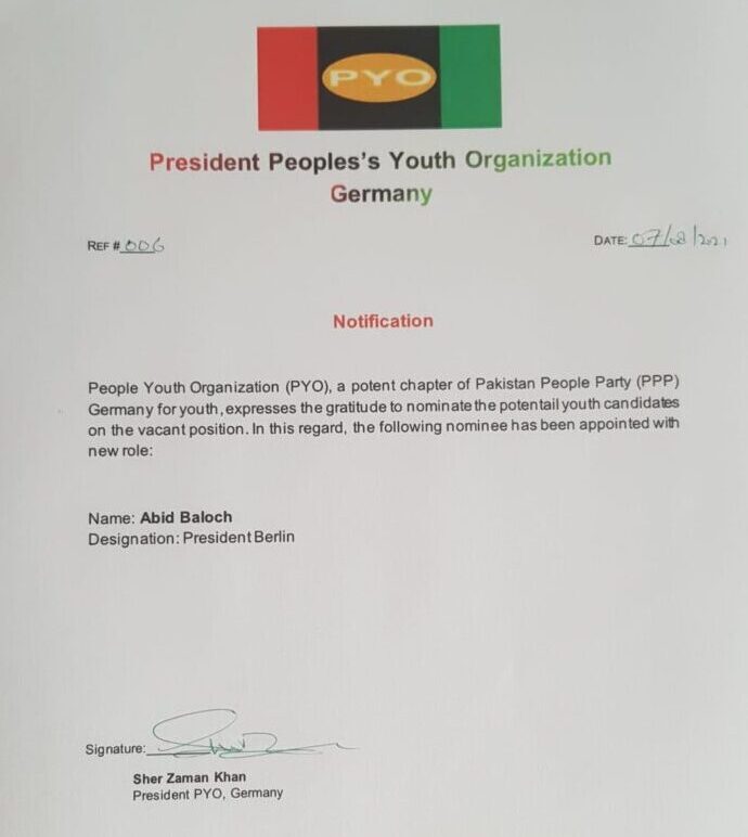 PPP Germany President appointed Abid Hussain Baloch, President of the People’s Students Federation for Berlin and Talal Ahmed as General Secretary while for North West Fallen Province Abdul Wahab as President and Zubair Butt as General Secretary. The names were announced officially and notifications were issued.