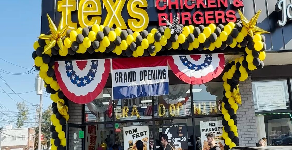 Texs Chicken franchise was decorated with balloons and other decorative items in its similar colors at opening ceremony.