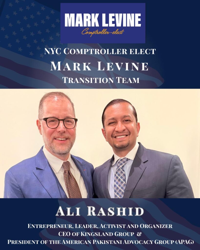 NEWYORK: Prominent Pakistani American entrepreneur, leader, activist, and organizer Ali Rashid has been selected to join New York City Comptroller-elect Mark Levine’s transition team, alongside an outstanding group of business and civic leaders.