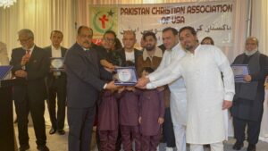 Later, the guests were presented with the book “America Mere Agey” as a gift. A cake was cut on the occasion of Christmas, while the Pakistan Christian Association presented awards to various personalities for community services.